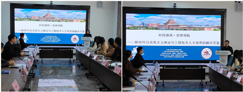 为深入学习贯彻党的二十届四中全会精神、提升教育强国建设的思政引领力、聚焦科技与人文的高质量融合、进一步推进马克思主义理论学科的优化发展,2025年11月15日上午,哈尔滨工业大学(威海)马克思主义学院、信息科学与工程学院师生代表,与到访的山东大学马克思主义学院师生代表、“科技与人文面对面”工作室成员展开“科技强国·思想领航——新时代马克思主义理论与工程技术人才培养的融合互鉴”联学共建活动。活动在校区探海楼举行,由哈工大(威海)马院党委书记吴琼主持。