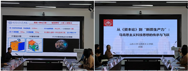 在主旨报告环节,哈工大(威海)信息学院罗清华教授以《国内首颗面向海洋目标探测的通遥一体化卫星星座“威海壹号”》为题,系统介绍了卫星的研制背景、技术突破与应用前景,并立体化呈现了其在蓝碳监测、海上救援等领域的业务化应用成果。山大马院闵琪副教授作了题为《从〈资本论〉到“新质生产力”:马克思主义科技思想的传承与飞跃》的报告,从理论维度梳理了马克思主义科技观的历史脉络和时代内涵,结合党的二十届四中全会精神剖析了从马克思主义科技观到“新质生产力”的演变过程,并强调科技发展应坚持“以人民为中心”的价值导向。